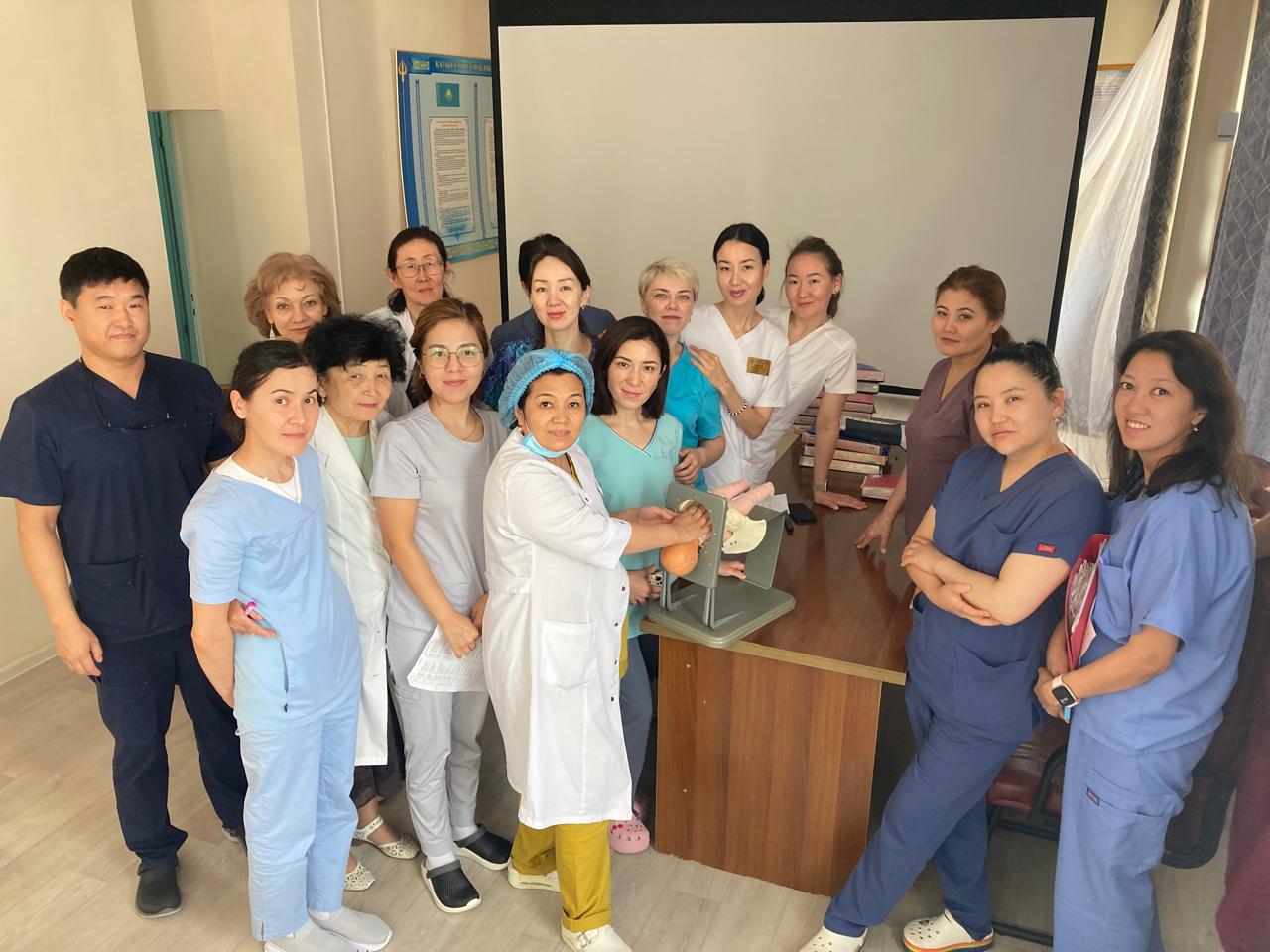 В Городском перинаталтном центре совместно кафедрой акушерства и гинекологии НАО "МУА" прошло занятие по дистанции плечиков плода с отработкой практических навыков на муляже